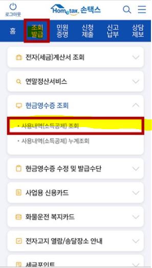 손택스에서 현금영수증 조회하기