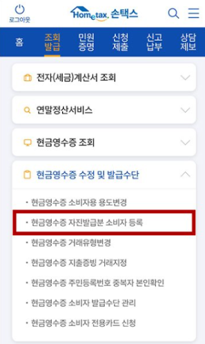 조회/발급 > 현금영수증 수정 및 발급수단 > 자진발급분 소비자 등록으로 이동